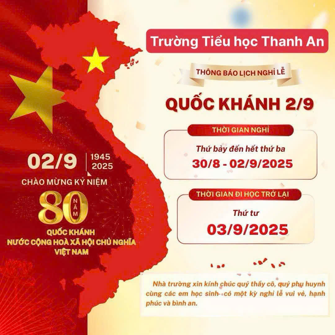 Trường Tiểu học Thanh An trân trọng thông báo về việc nghỉ dịp lễ Quốc Khánh năm 2025: